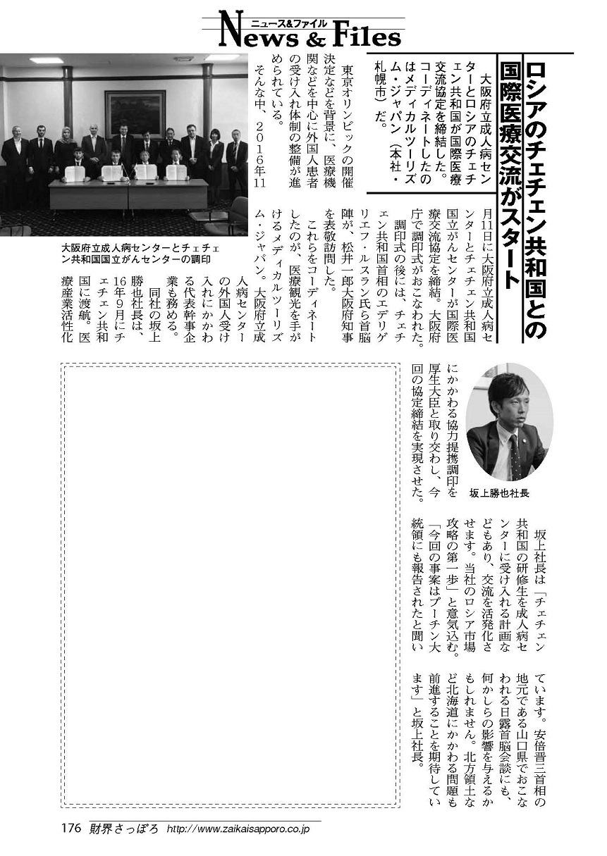 2016.11.11 经过本公司的调和与安排, 俄罗斯联邦车臣共和国立癌症中心与大阪府立成人病中心(2017年3月改名为大阪国际癌症中心)签署了国际医疗交流合作协议,并对大阪府知事进行了礼节性拜访以及交换了意见。